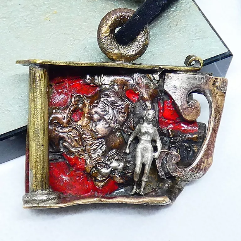 Inicio / Joyeria Artesanal Contemporánea / Joyería en Bronce / Colgante Único Bronce Fondo Rojo