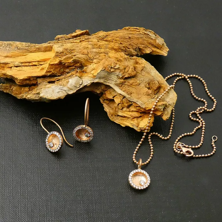 Exquisito colgante en forma esférica plana en plata de ley con baño de oro rosa.