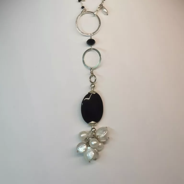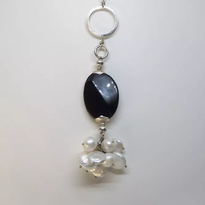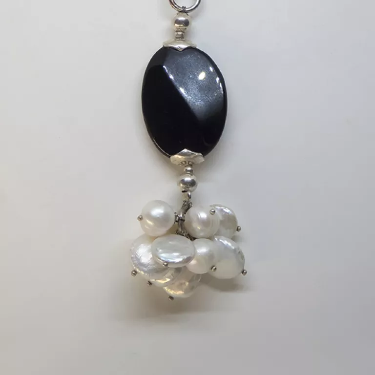 Racimo de Onix negro tallado Oval facetado y perla de agua dulce.