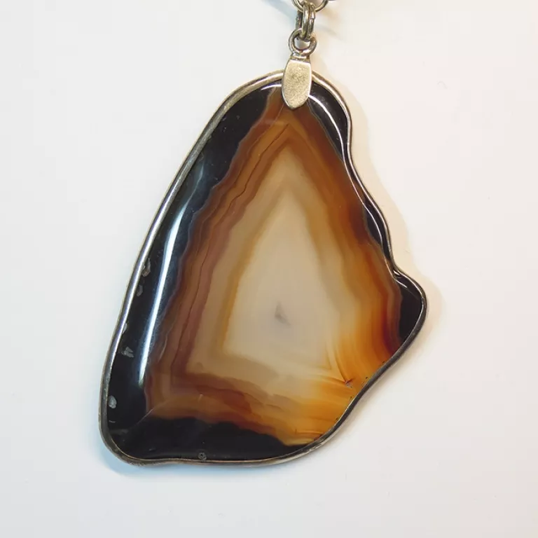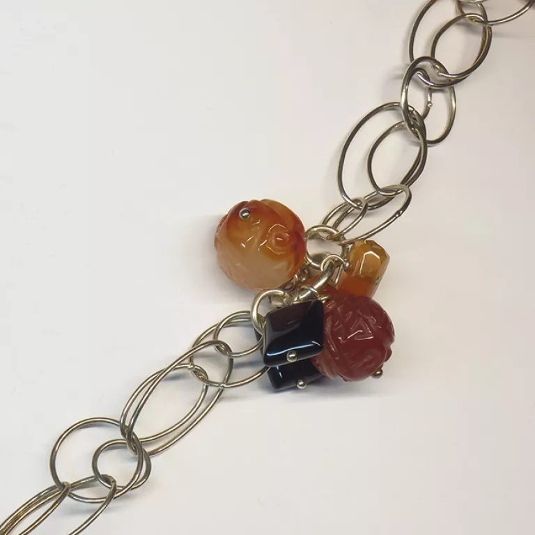 Racimos esparcidos a lo largo de la cadena compuestos por onix negro, carneola y ágatas talladas
