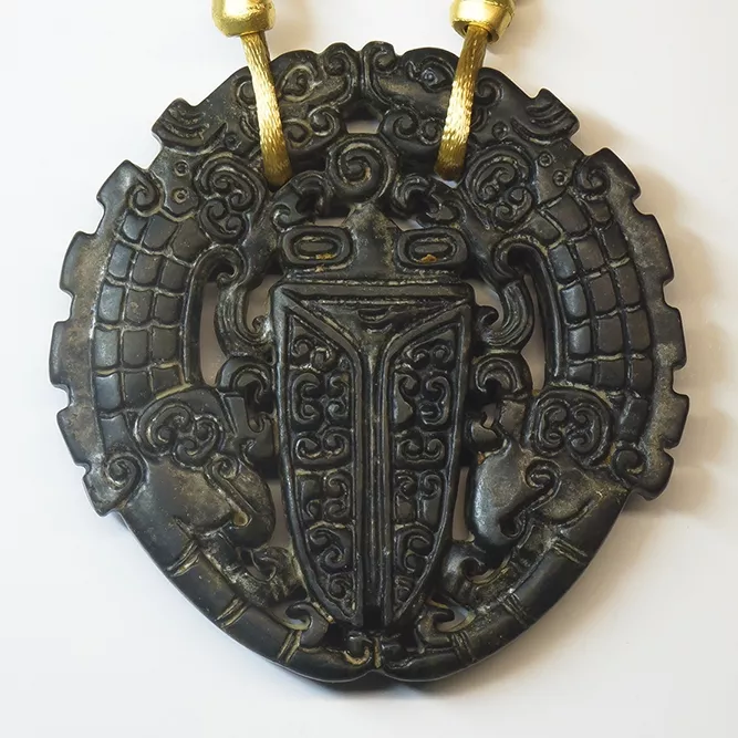 Colgante de jade negro, con una figura de escarabajo tallada. Reversible.