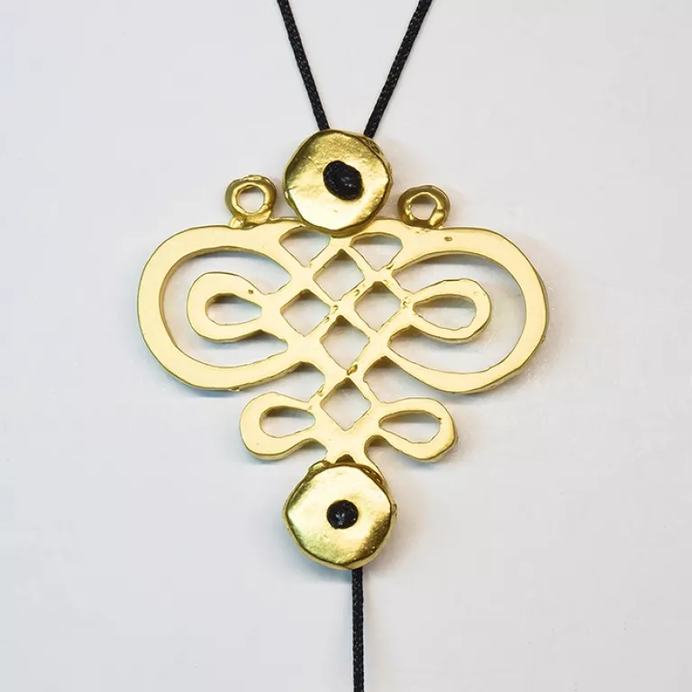 Cenefa central y fornituras en latón con baño de oro mate.