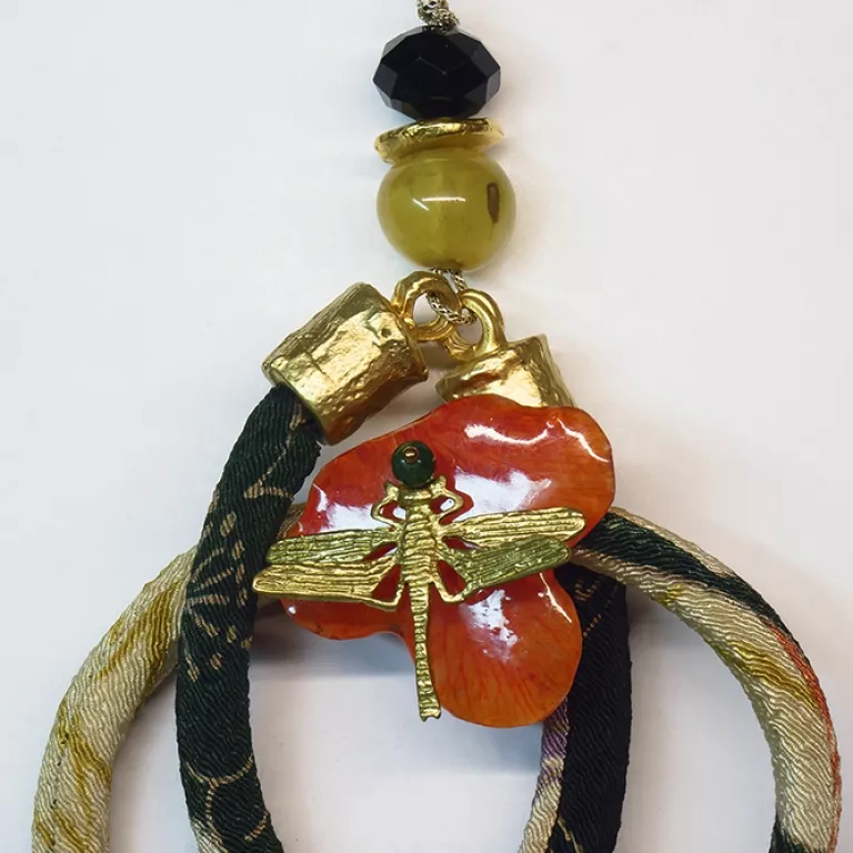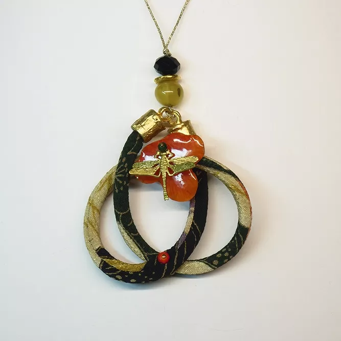Exquisita y elegante colección a base de retales de telas japonesas procedentes de sus maravillosos kimonos. Combinada con el oro mate (latón) o con bronces africanos, dan como resultado, estas piezas originales, únicas y exclusivas. Hecho a mano en España. Originalidad y exclusividad en sus piezas elaboradas a mano con piezas bañadas en oro mate.