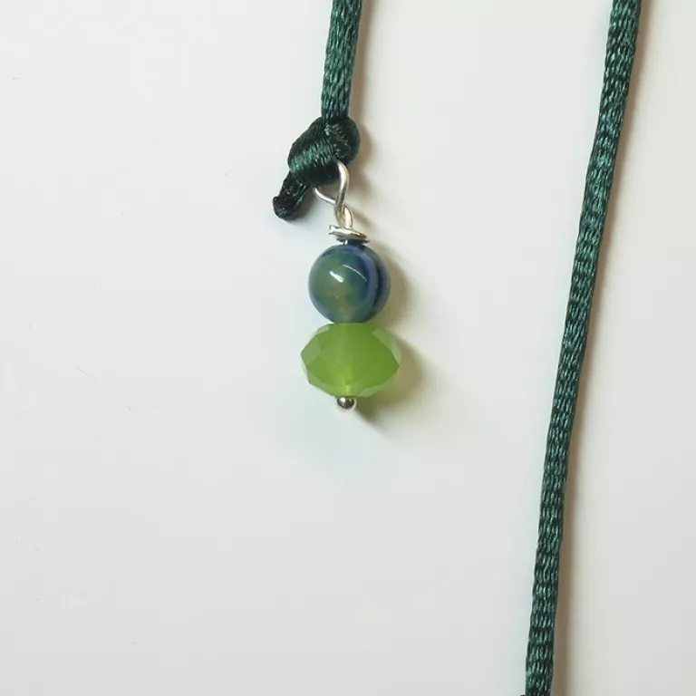 Rematado cada extremo por dos bolas de ágatas talladas en tonos verde.