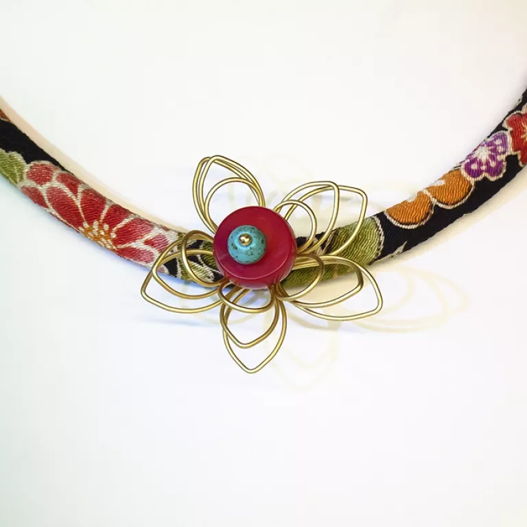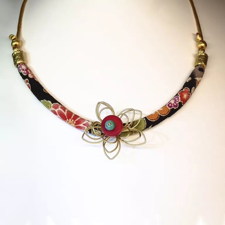 Espectacular Collar elaborado con retales de Kimono japonés con fondo negro.