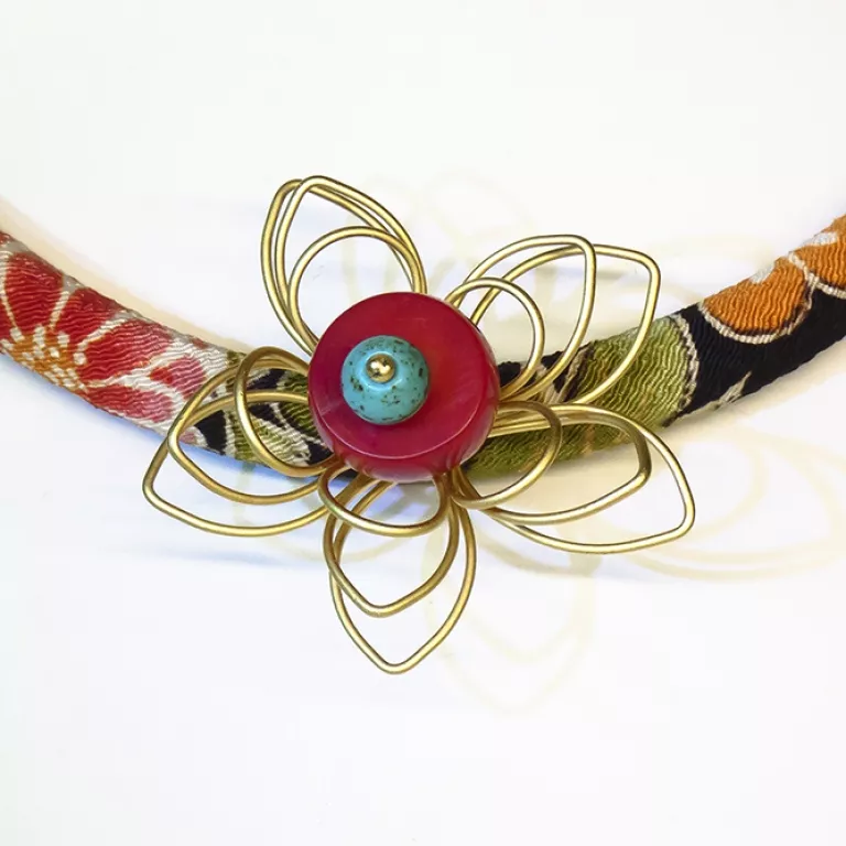Exquisita y elegante colección a base de retales de telas japonesas procedentes de sus maravillosos kimonos. Combinada con el oro mate (latón) o con bronces africanos, dan como resultado, estas piezas originales, únicas y exclusivas. Hecho a mano en España. Originalidad y exclusividad en sus piezas elaboradas a mano con piezas bañadas en oro mate.