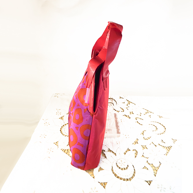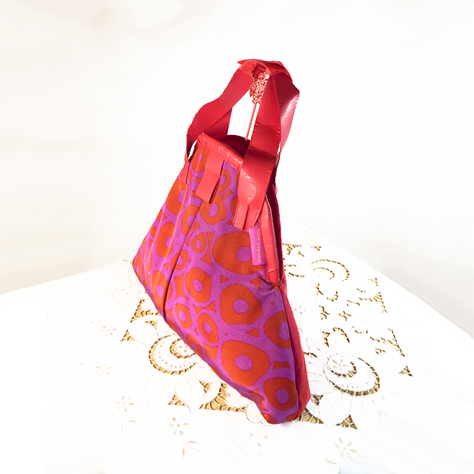 Bolso con doble cara;  por la parte trasera, seda lisa en color rojo y por la parte delantera en algodón fondo morado con círculos rojos.